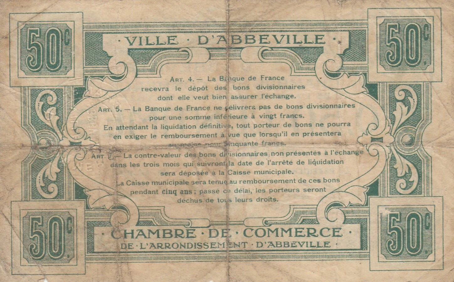 The 50 centime banknote issued by the Abbeville Chamber of Commerce, dating from the period 1914-1925, represents a form of emergency currency used in France during the difficult economic context of the First World War and its immediate aftermath.