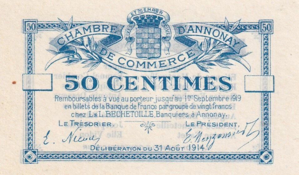 The 50 centimes voucher from the Annonay Chamber of Commerce dated August 31, 1914 belongs to the unissued emergency currency projects, designed in haste at the very beginning of the First World War. From the first weeks of the conflict, the rapid disappearance of divisional currency pushed many local institutions to prepare monetary solutions.