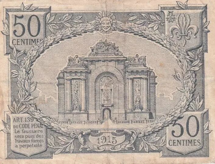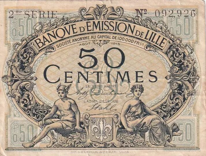 Le billet de 50 centimes de la Banque d'Émission de Lille, daté d'août 1915, appartient à la deuxième série émise par cette institution. Le recto du billet, rédigé en latin, présente les inscriptions suivantes : "BANQUE D’ÉMISSION DE LILLE AOÛT 1915" en haut du billet. La valeur nominale "50 CENTIMES" est indiquée au centre.