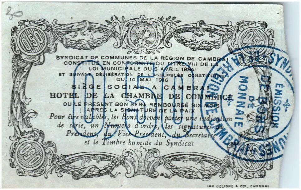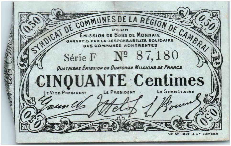 Banknote France 50 Centimes Cambrai City