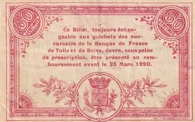 This 50-centime note was issued by the Chamber of Commerce of Tulle, in the Corrèze department, France, in 1915. It belongs to series A and represents a form of local currency issued during a period of crisis or economic necessity during the First World War.