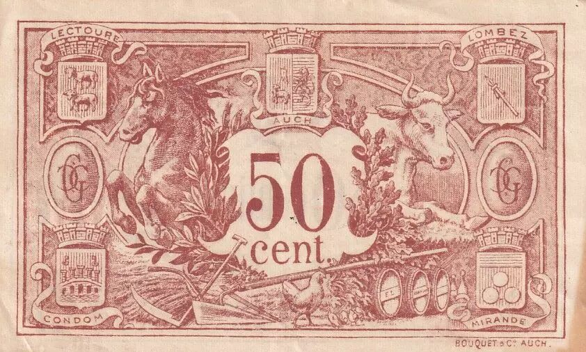 The back of the note presents a geographical layout of the towns of Lectoure, Auch, and Lombez at the top, and Condom and Mirande at the bottom. The nominal value "50 cent." is inscribed in the center. The printer, BOUQUET & Co Imr AUCH, is also mentioned on the back.