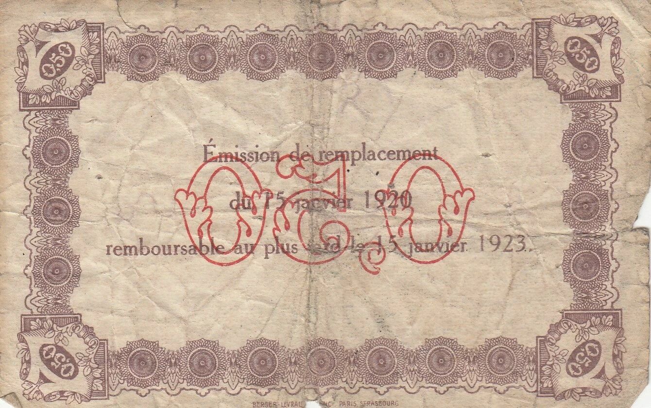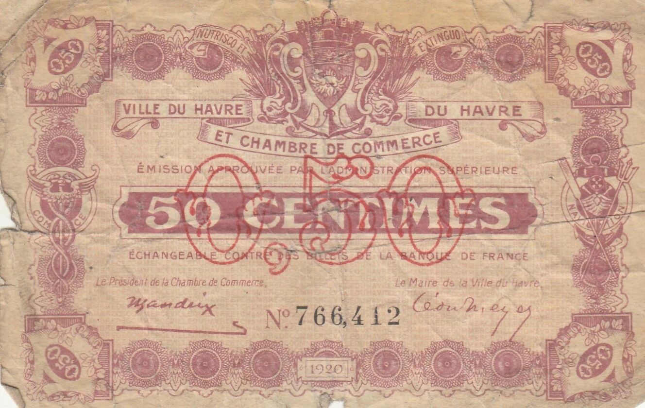 This 50 centime note was issued by the Le Havre Chamber of Commerce in 1920. It is an emergency issue, often put in place during periods of economic crisis or currency shortage.