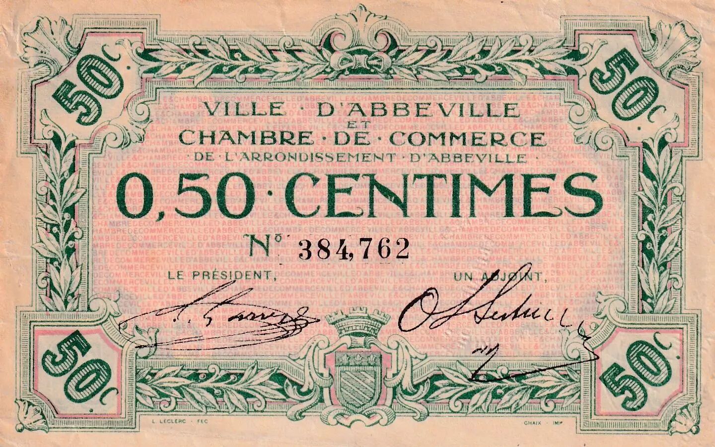 Ce billet de 50 centimes a été émis par la Ville d'Abbeville et la Chambre de Commerce de l'Arrondissement d'Abbeville. Le recto du billet présente un cadre orné de motifs végétaux. La valeur nominale de "50 C" est clairement indiquée, ainsi que la dénomination de l'émetteur : "VILLE D'ABBEVILLE ET CHAMBRE DE COMMERCE DE L'ARRONDISSEMENT D'ABBEVILLE". La valeur en toutes lettres, "0,50 CENTIMES", figure également. Un numéro de série est présent, suivi des mentions "LE PRESIDENT" et "UN ADJOINT", laissant un espace pour les signatures. La mention "L.LECLERC FEC CHAIX - IMP" indique le dessinateur, Léon Leclerc, et l'imprimeur, l'Imprimerie Chaix.