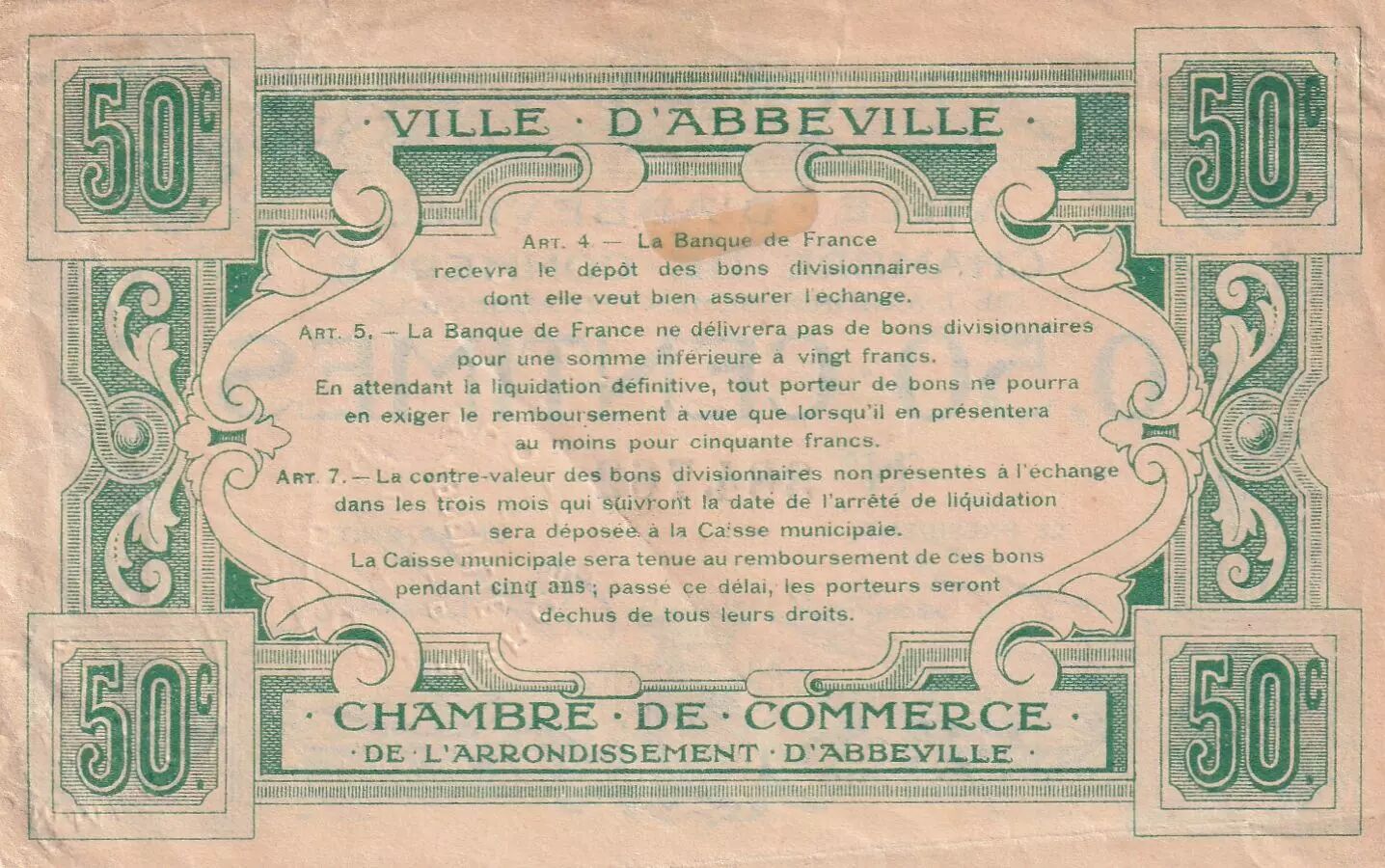 Le verso du billet présente un cadre à motifs géométriques. On y retrouve la valeur nominale "50. C" et la dénomination de l'émetteur "VILLE D'ABBEVILLE CHAMBRE DE COMMERCE DE L'ARRONDISSEMENT D'ABBEVILLE". Des articles relatifs à la Banque de France et aux conditions d'échange et de remboursement des bons divisionnaires sont inscrits. L'article 4 précise que la Banque de France reçoit le dépôt des bons divisionnaires. L'article 5 stipule que la Banque de France ne délivre pas de bons divisionnaires pour une somme inférieure à 20 francs et que le remboursement à vue n'est possible que pour une présentation d'au moins cinquante francs. L'article 7 indique que la contre-valeur des bons non présentés à l'échange dans les trois mois suivant la date de liquidation sera déposée à la Caisse municipale, laquelle sera tenue au remboursement pendant cinq ans, après quoi les porteurs seront déchus de leurs droits.