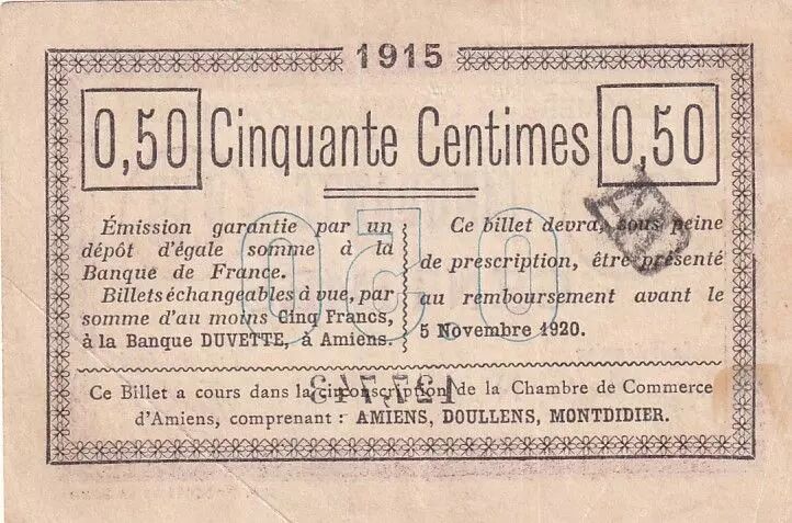 Le revers du billet répète la valeur nominale "0,50" et "CINQUANTE CENTIMES". Une mention importante précise que l'émission est garantie par un dépôt d'égale somme à la Banque de France, assurant ainsi la confiance dans ce moyen de paiement. Il est également indiqué que les billets sont échangeables à vue par somme d'au moins Cinq Francs à la Banque DUVETTE à Amiens. Une clause de prescription stipule que le billet devait être présenté au remboursement avant le 5 Novembre 1920. Enfin, il est précisé que ce billet a cours dans le ressort de la Chambre de Commerce d'Amiens, comprenant les villes d'Amiens, Doullens et Montdidier.