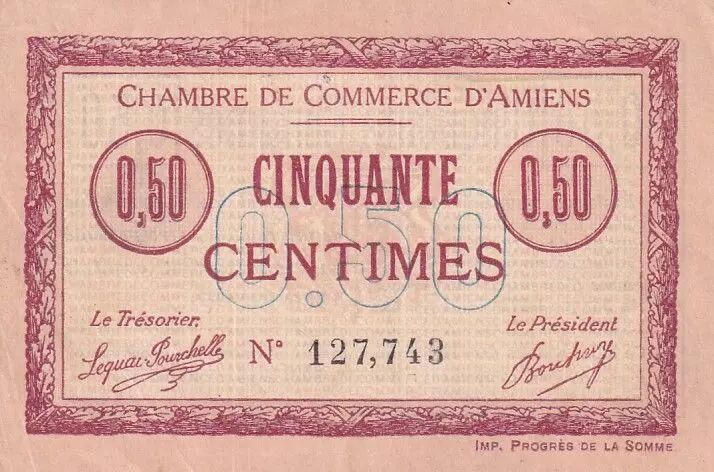 L'avers du billet présente les inscriptions "CHAMBRE DE COMMERCE D'AMIENS" en lettres majuscules, soulignant l'autorité émettrice. La valeur nominale, "0,50", est répétée de part et d'autre de la mention "CINQUANTE CENTIMES". On y trouve également les signatures du Trésorier et du 1er Vice-Président de la Chambre de Commerce. La mention "IMP, PROGRES DE LA SOMME" indique l'imprimerie responsable de la production du billet.
