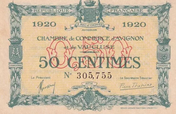 Ce billet de 50 centimes a été émis par la Chambre de Commerce d'Avignon en 1920. Il s'inscrit dans le contexte de la Première Guerre mondiale, comme l'indique la mention "Guerre Européenne de" sur le recto.