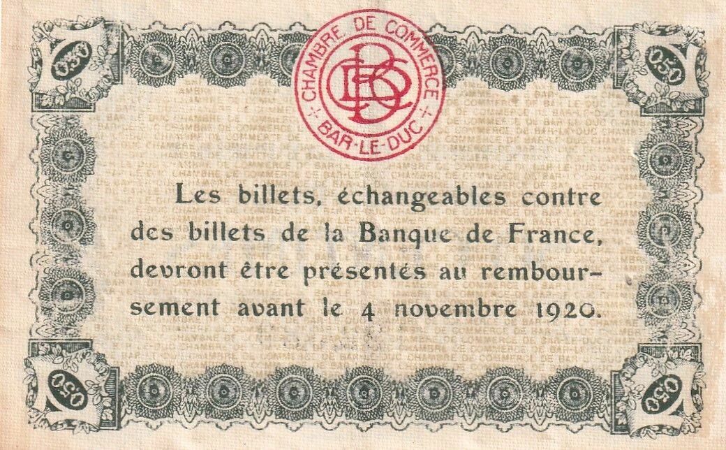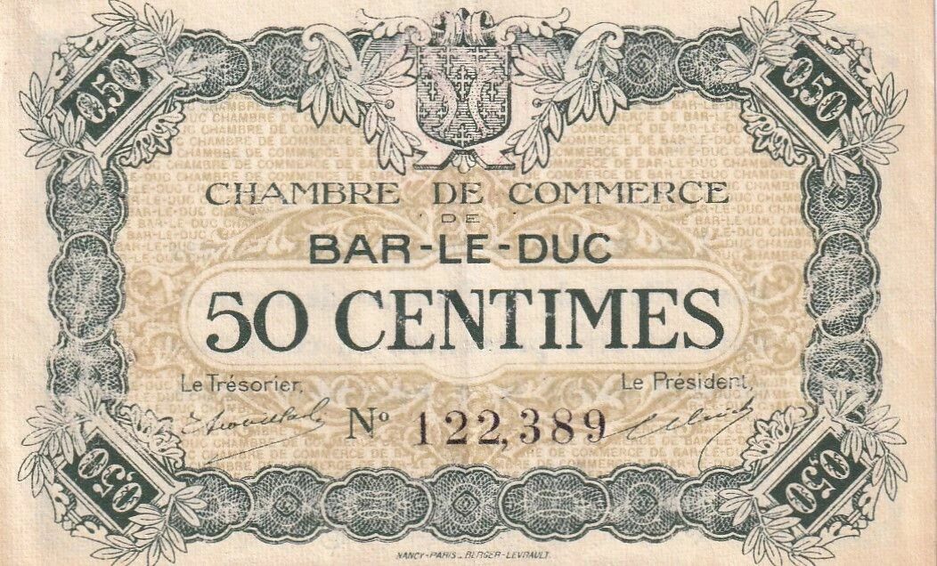 Ce billet de 50 centimes a été émis par la Chambre de Commerce de Bar-le-Duc en 1915. Il s'agit d'un type de papier-monnaie émis localement en période de crise ou de pénurie de monnaie nationale.