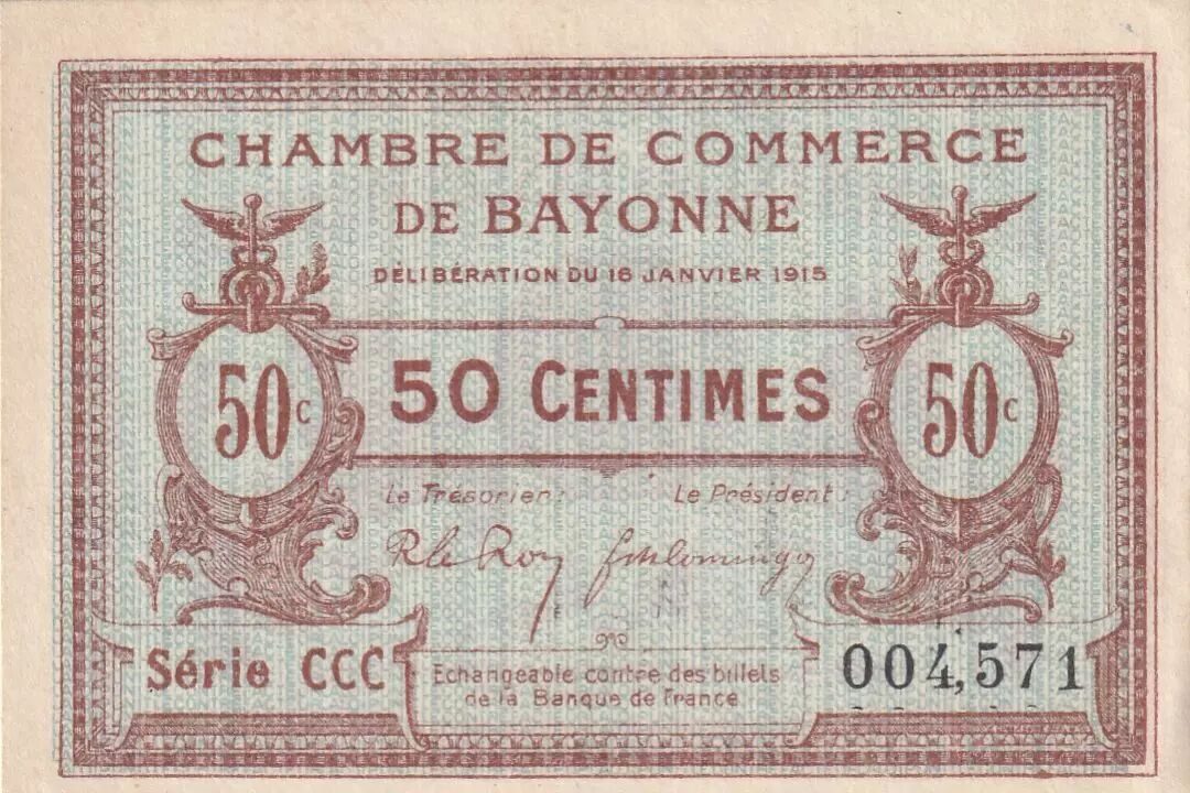 The 50-centime banknote issued by the Bayonne Chamber of Commerce, dated January 16, 1915, is a testament to local monetary issues in France during the First World War. This banknote is part of the CCC Series and features a unique serial number, illustrated here by [004,571].