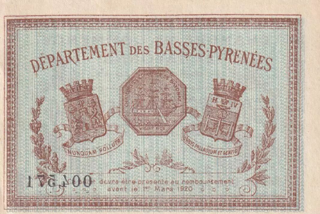 The reverse of the banknote bears the inscription "DEPARTEMENT DES BASSES-PYRENEES," geographically locating the issue. A redemption clause is stipulated: "Ce billet devra être présenté au remboursement avant le [1er Mars 1920]," setting a deadline for its exchange. The inscriptions are written in Latin.