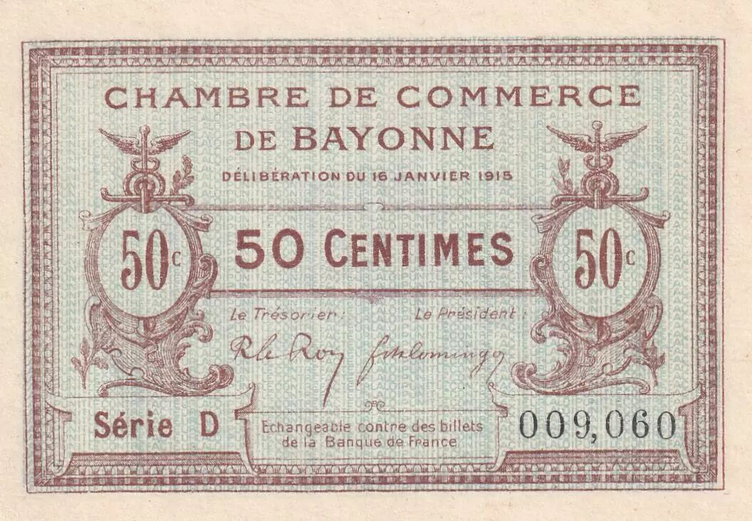 This 50 centime banknote was issued by the Bayonne Chamber of Commerce in France, following the deliberation of January 16, 1915. It is an emergency issue, implemented during the First World War to compensate for the shortage of currency.