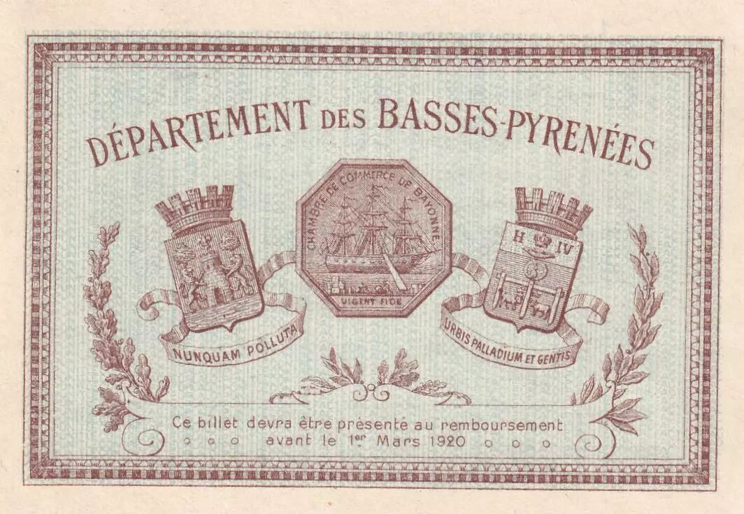 The back of the banknote bears the mention "DEPARTEMENT DES BASSES-PYRENEES". Important information is inscribed, stipulating that this banknote had to be presented for reimbursement before March 1, 1920, indicating a deadline for its validity.