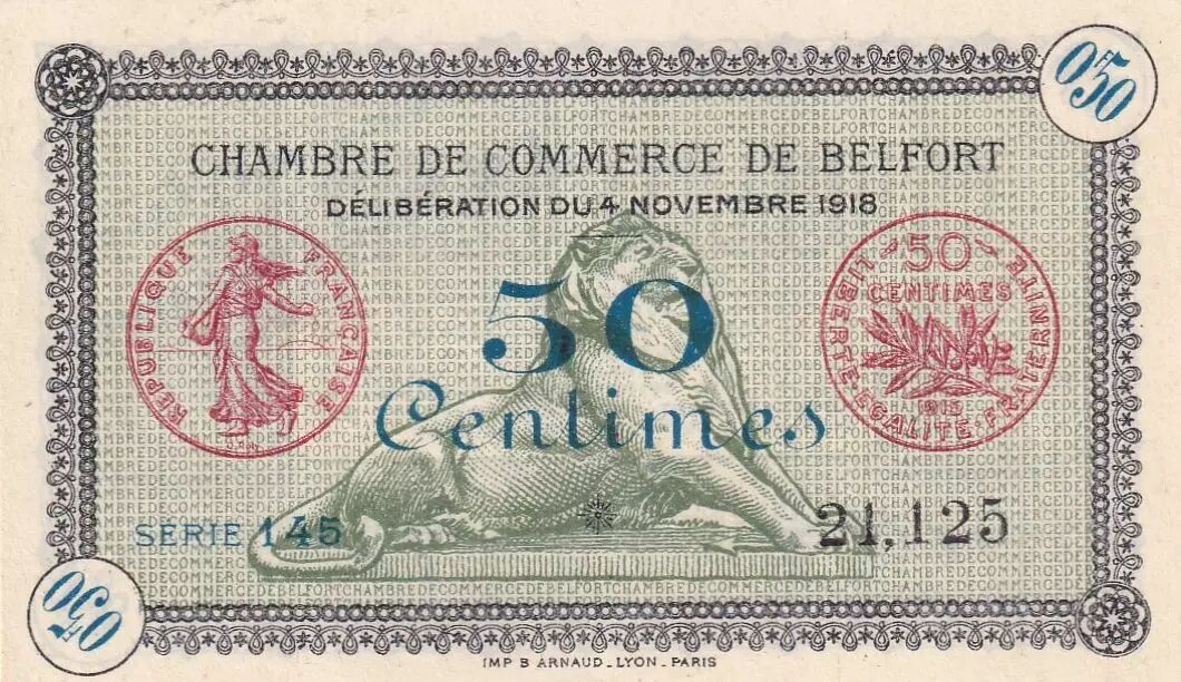 This 1 franc banknote was issued by the Belfort Chamber of Commerce on December 21, 1918. It belongs to the second series of this local issue. The front of the banknote features the Lion of Belfort statue, an emblematic monument of the city.