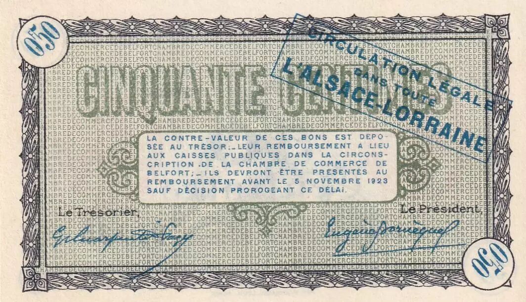 On the back, the face value "1 FRANC" is displayed in large format. A text specifies that the counter-value of these vouchers is deposited in the treasury and that their reimbursement is made at public cash desks within the district of the Belfort Chamber of Commerce. The repayment deadline is set for December 22, 1923, unless a renewal decision is made. The functions of the treasurer and vice-president are mentioned without the names of the people occupying them.