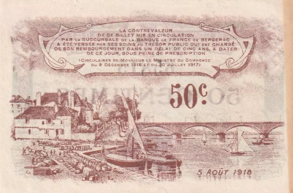 Ce billet de 50 centimes a été émis par la Chambre de Commerce de Bergerac le 5 août 1918. Il s'agit d'un type de papier-monnaie émis en période de pénurie de monnaie métallique, durant la Première Guerre mondiale.