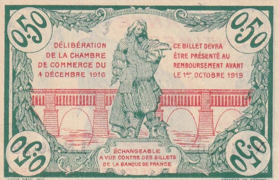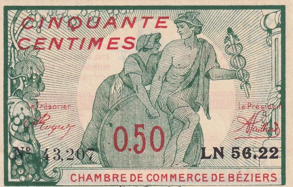 Ce billet de 50 centimes a été émis par la Chambre de Commerce de Béziers en 1916, comme l'indique la délibération inscrite au verso, datée du 4 décembre 1916.