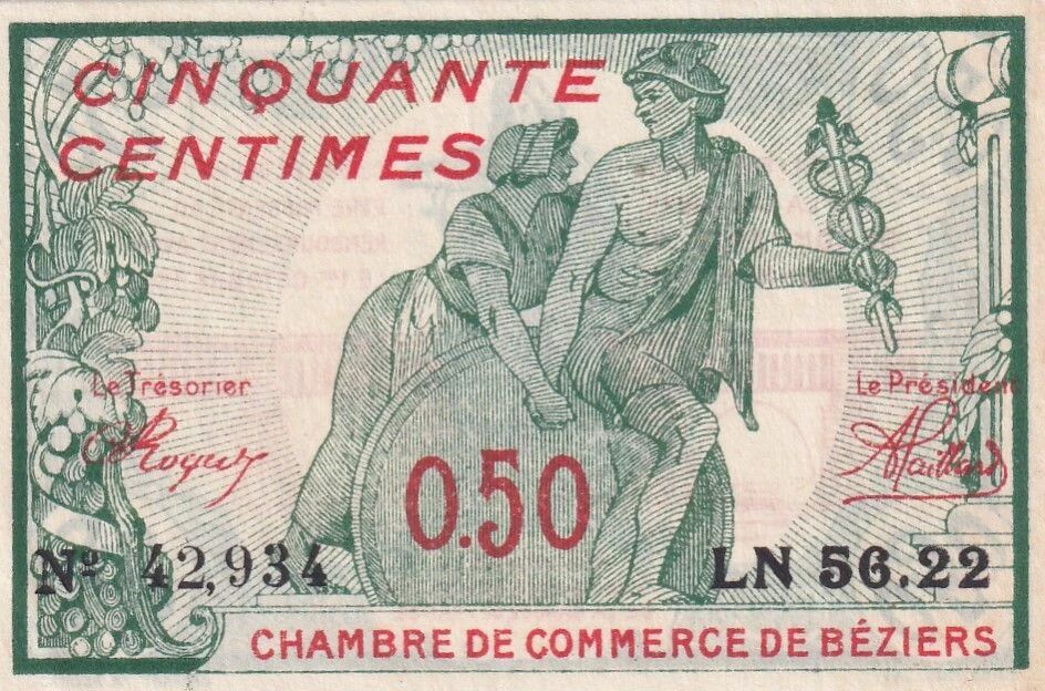 Ce billet de 50 centimes a été émis par la Chambre de Commerce de Béziers en 1916. Il appartient à la série LN 56.22 et porte le numéro 42.934.