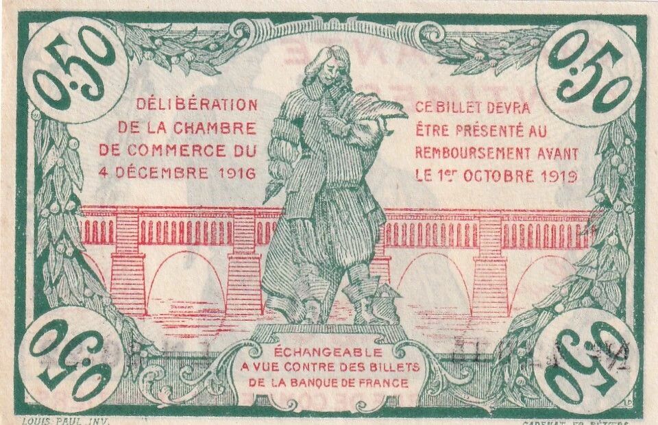 Le revers du billet porte la mention "DÉLIBÉRATION DE LA CHAMBRE DE COMMERCE DU 4 DÉCEMBRE 1916". Une clause importante stipule que "CE BILLET DEVRA ÊTRE PRÉSENTÉ AU REMBOURSEMENT AVANT LE 1er OCTOBRE 1919". Il est précisé que le billet est "ÉCHANGEABLE A VUE CONTRE DES BILLETS DE LA BANQUE DE FRANCE". La signature "LP" et la mention "LOUIS PAUL. INV. CADENAT FR. BEZIERS" indiquent l'artiste et l'imprimeur responsables de la conception et de la production du billet. Louis Auguste Albert Paul est identifié comme le dessinateur, tandis que l'imprimerie Cadenat Fr. à Béziers, France, a réalisé l'impression.