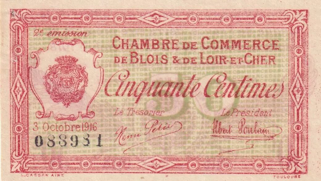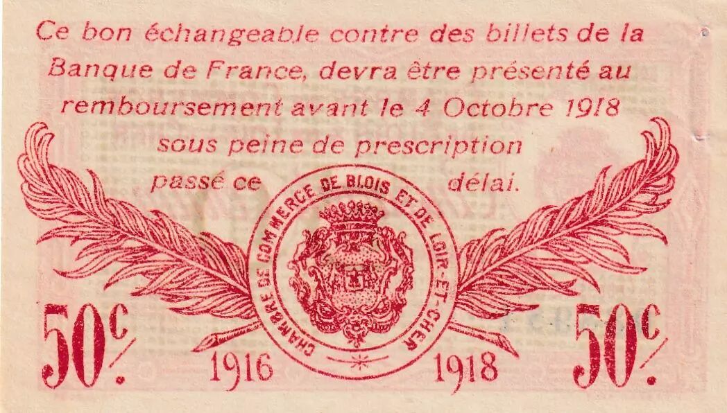 This 50-centime banknote was issued by the Chamber of Commerce of Blois and Loir-et-Cher. It is a banknote from the second issue, dated October 3, 1916. The deadline for redeeming this banknote was October 4, 1918.