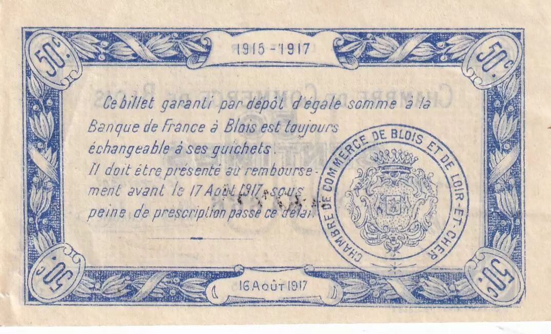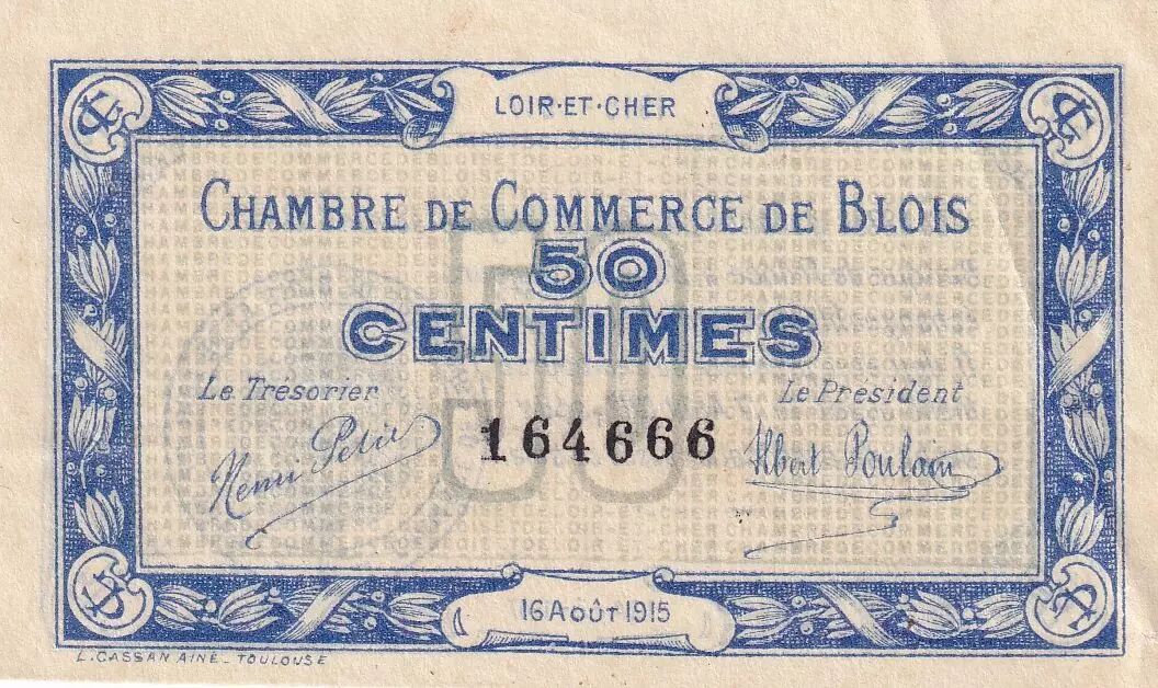Ce billet de 50 centimes a été émis par la Chambre de Commerce de Blois et du Loir-et-Cher, en France. Il date du 3 octobre 1916, mais fait partie d'une émission datée du 16 août 1915. Son numéro d'identification est le 164 666.
