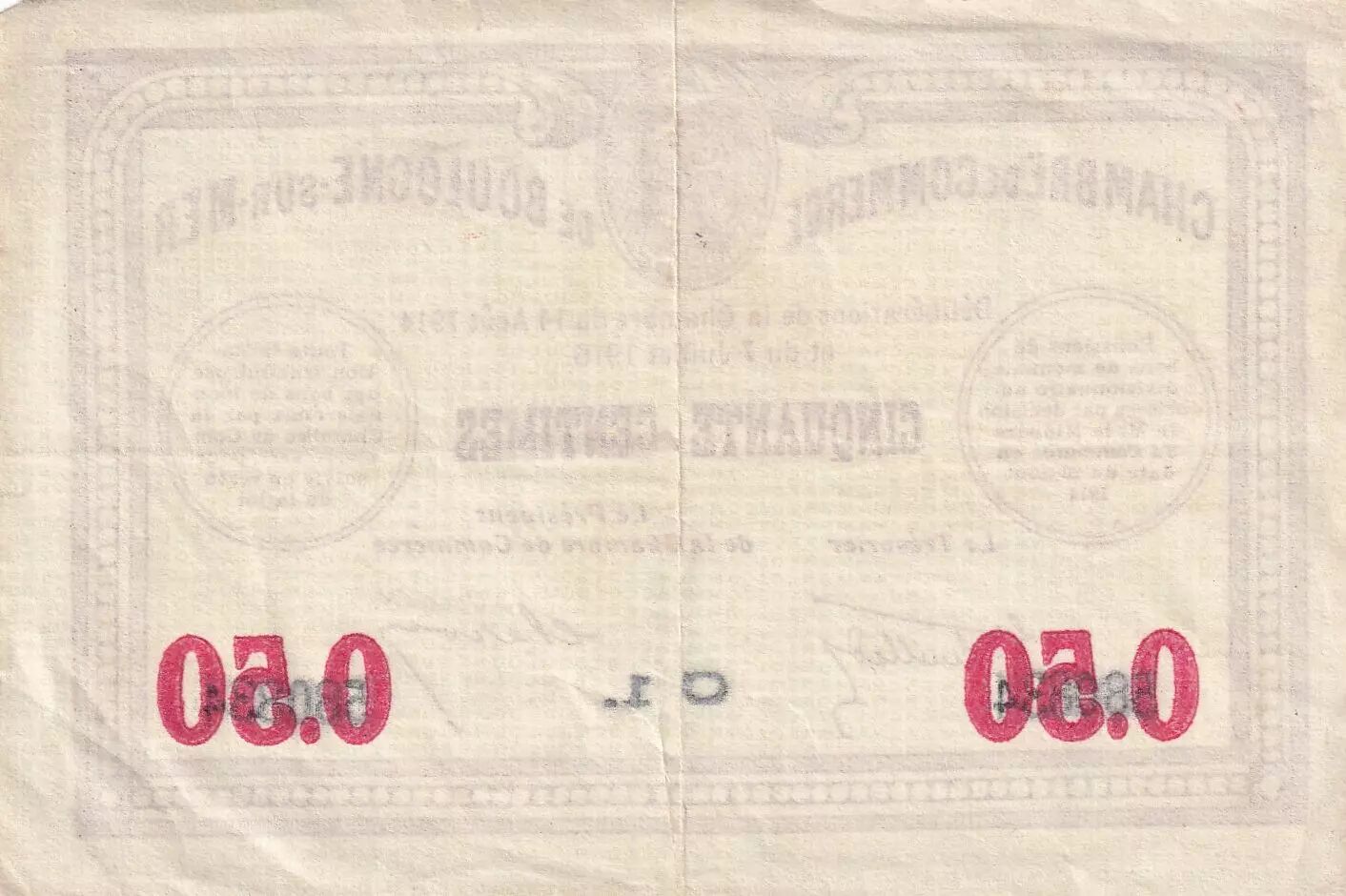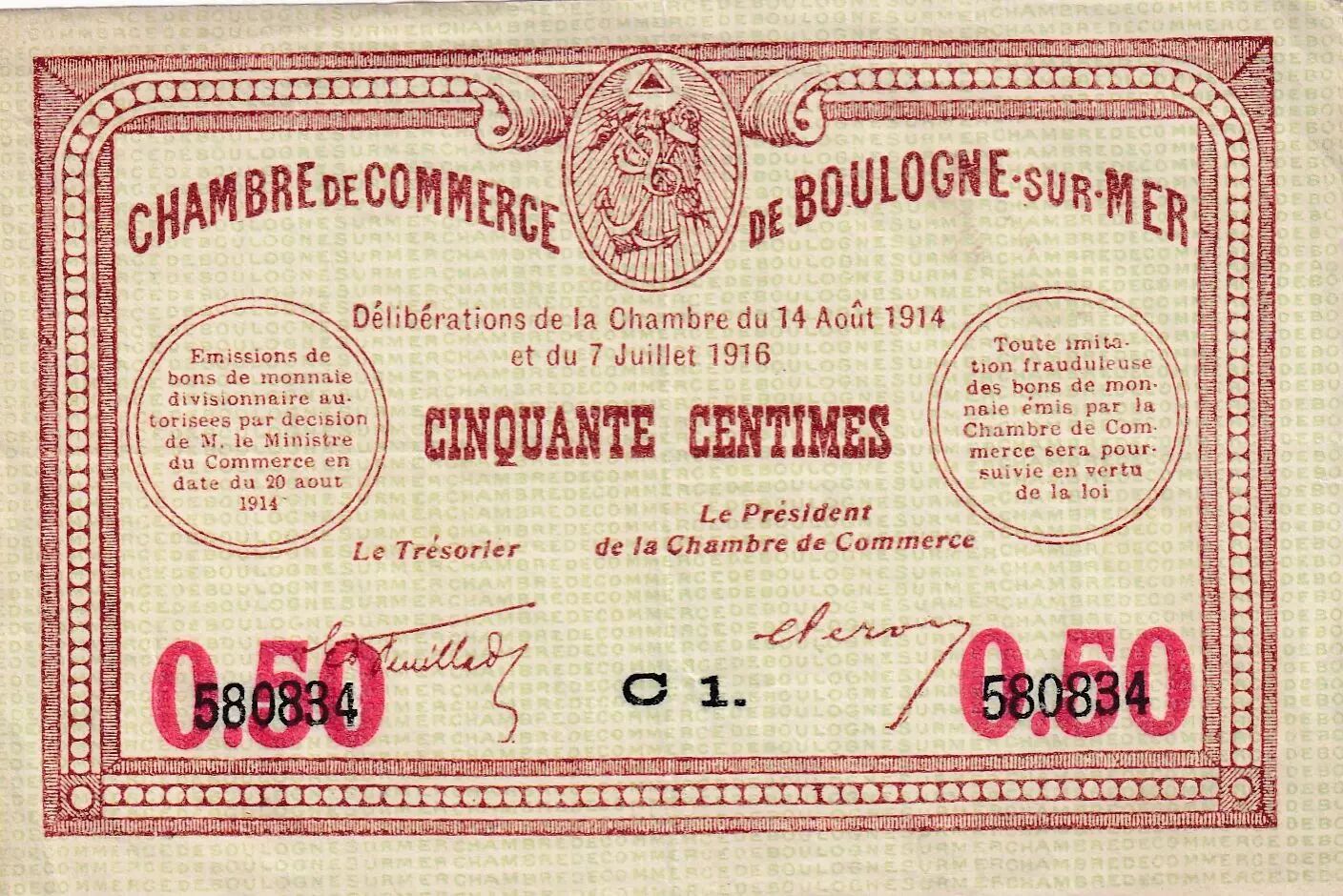 Ce billet de 50 centimes a été émis par la Chambre de Commerce de Boulogne-sur-Mer, en France. La date d'émission inscrite est le 14 août 1914. Il s'agit d'un billet de nécessité, émis dans un contexte où les moyens de paiement habituels étaient perturbés.