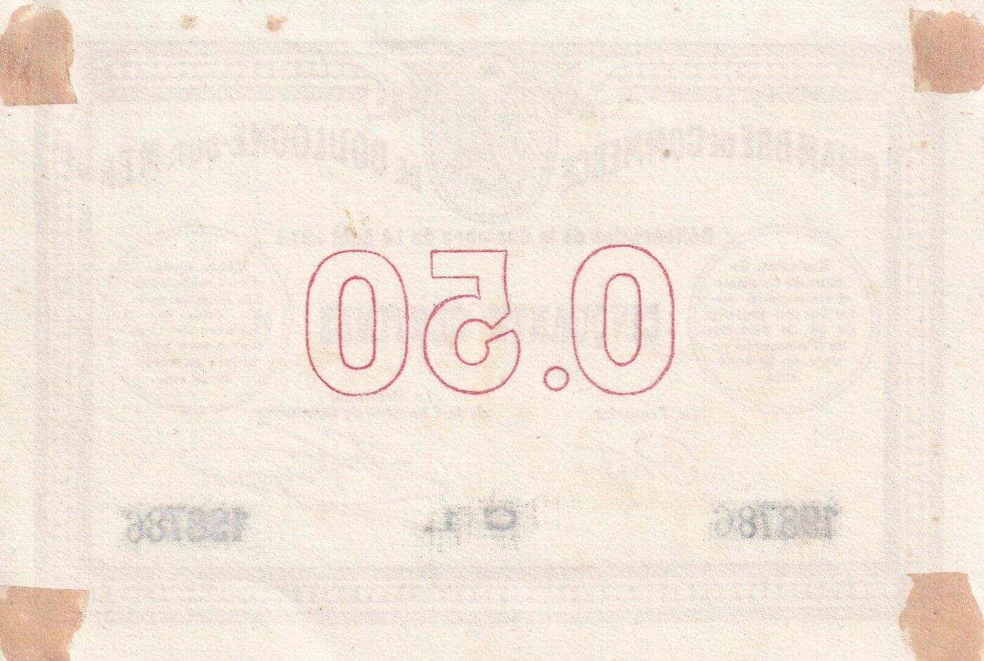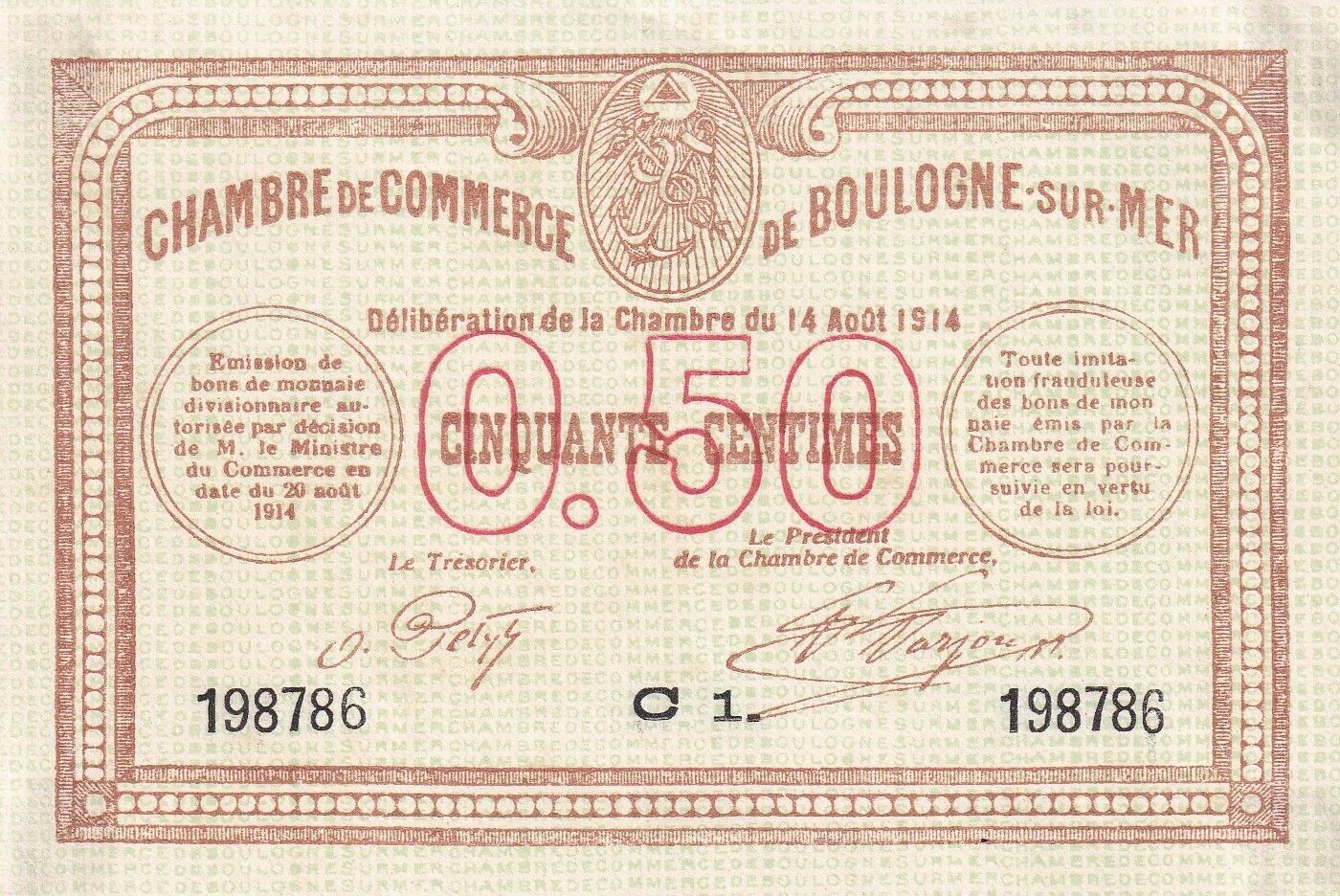 Ce billet de 50 centimes a été émis par la Chambre de Commerce de Boulogne-sur-Mer, en France. Il s'agit d'une émission de nécessité datant du 14 août 1914, période marquée par le début de la Première Guerre mondiale. Ces billets étaient destinés à pallier le manque de monnaie divisionnaire en circulation.