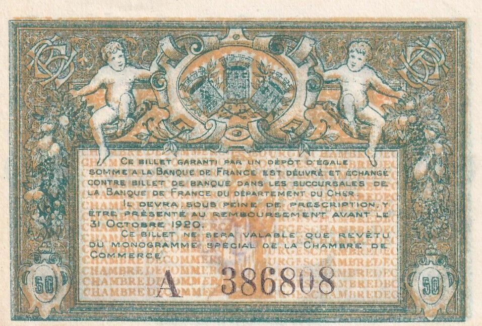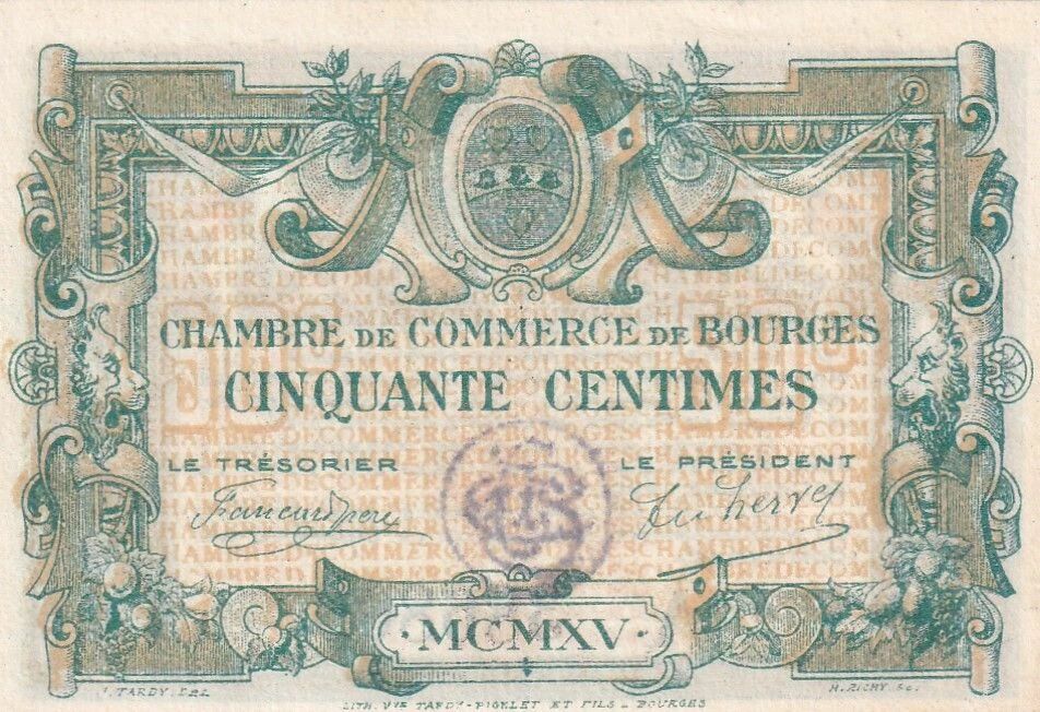 Le billet de 50 centimes émis par la Chambre de Commerce de Bourges en 1915, Série A, constitue un témoignage des émissions de nécessité durant la Première Guerre mondiale. Ce billet, d'une valeur nominale de cinquante centimes de franc, porte des inscriptions en langue latine.
