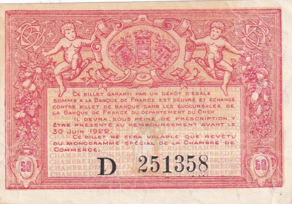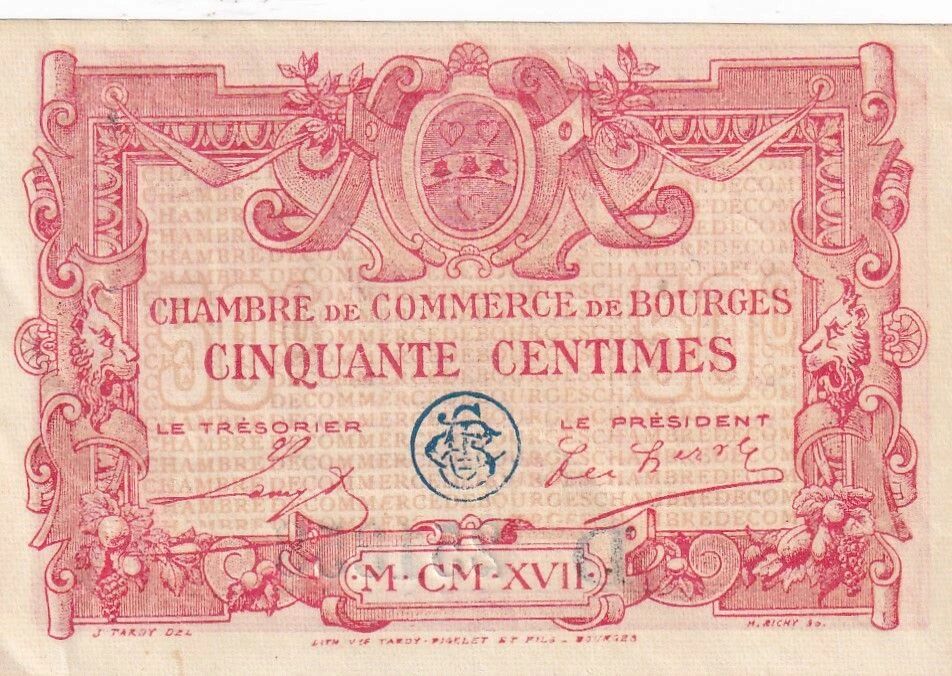 Ce billet de 50 centimes a été émis par la Chambre de Commerce de Bourges en 1917, appartenant à la Série D. Le recto du billet présente des inscriptions en latin, indiquant "CHAMBRE DE COMMERCE DE BOURGES" en lettres capitales. La valeur nominale, "CINQUANTE CENTIMES", est également mentionnée. Les noms du trésorier et du président de la Chambre de Commerce sont imprimés, aux côtés de la date "MCMXV" (1915), qui pourrait faire référence à l'année de conception ou d'approbation du billet.