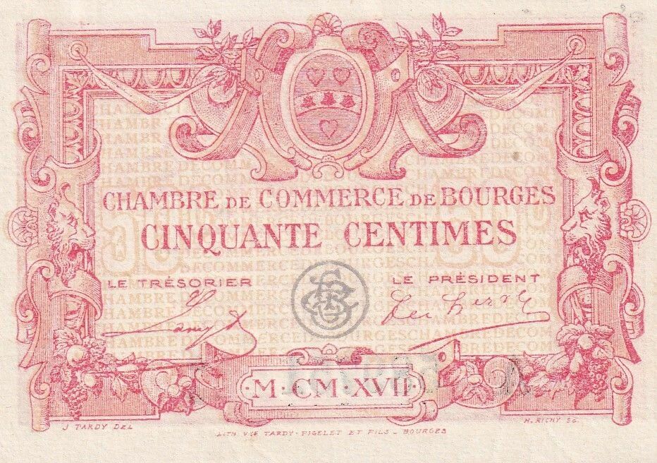 Ce billet de 50 centimes a été émis par la Chambre de Commerce de Bourges en 1920. Il appartient à la Série A et se distingue par son recto rédigé en latin.