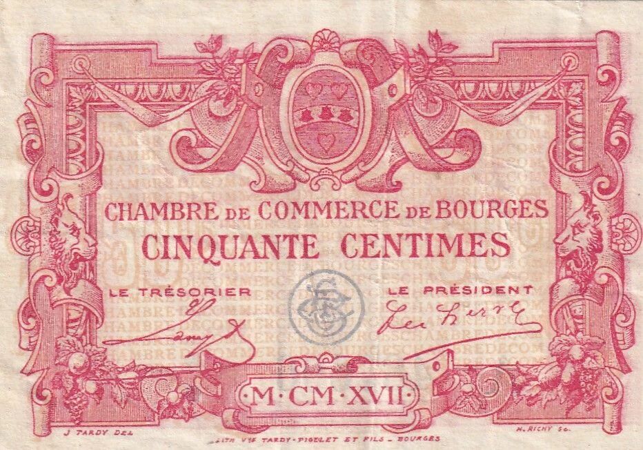 Sur le recto, l'inscription "CHAMBRE DE COMMERCE DE BOURGES" domine, suivie de la valeur nominale "CINQUANTE CENTIMES". Les signatures du Trésorier et du Président de la Chambre de Commerce sont également présentes. La mention "MCMXV" figure également sur ce côté du billet. J. Tardy est crédité pour la conception (DEL.) et la lithographie, avec la mention "Vve TARDY - PIGELET ET FILS - BOURGES". H. Richy est identifié comme le graveur (Sc.).