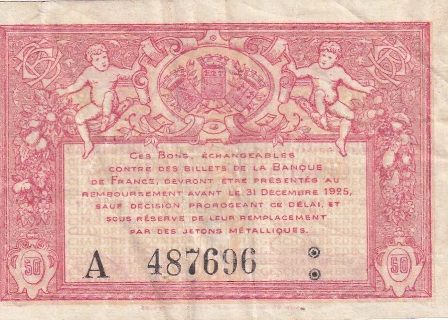 Le billet de 50 centimes émis par la Chambre de Commerce de Bourges en 1920, série A, est un témoignage de l'histoire monétaire française. Ce billet présente des caractéristiques graphiques distinctes sur son recto et son verso.