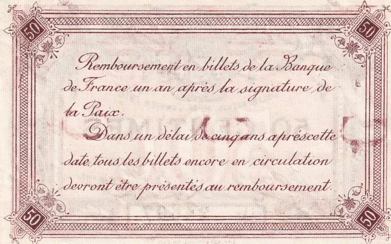 Le verso du billet présente un cadre ornemental orangé. L'inscription principale indique "Remboursement en billets de la Banque de France un an après la signature de la Paix." Une clause supplémentaire stipule que "Dans un délai de cinq ans après cette date, tous les billets encore en circulation devront être présentés au remboursement." La valeur "50" est également répétée sur ce côté.