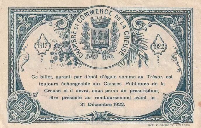 Le verso du billet présente l'inscription "1917 CHAMBRE DE COMMERCE DE LA CREUSE 1922", indiquant la période de validité du billet. Une mention précise que le billet doit être présenté au remboursement avant le 31 décembre 1922. Le nom de l'imprimeur, "IMP. P. DUMONT", est également présent.