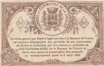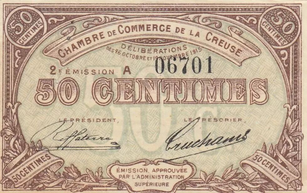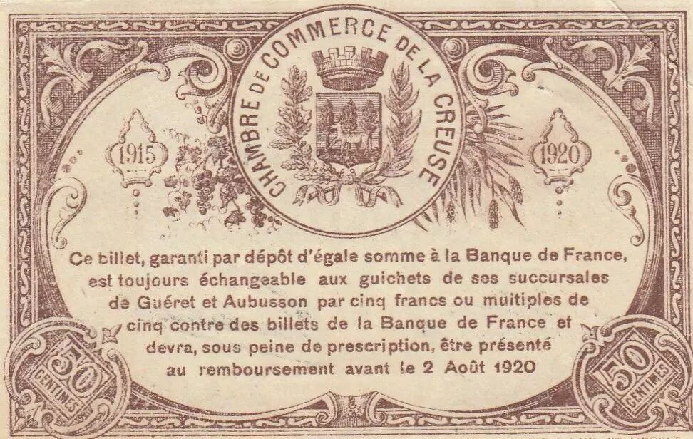 Ce billet de 50 centimes, émis par la Chambre de Commerce de la Creuse, date du 26 octobre 1915. Il appartient à la deuxième série d'émissions de cette chambre de commerce et est identifié par la Série A.