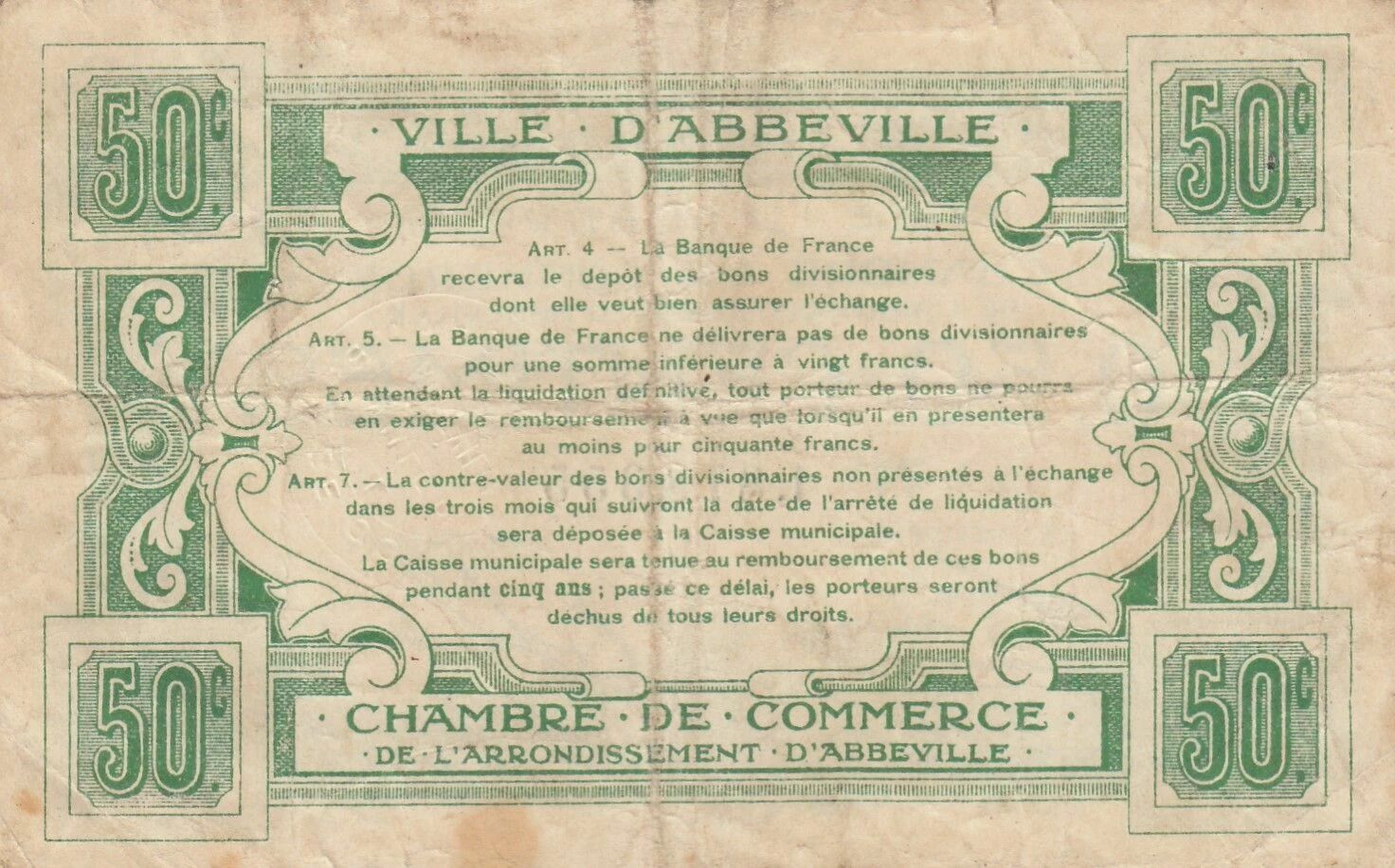 Ce billet, d'une valeur nominale de 50 centimes, fut émis par une institution locale, la Chambre de Commerce, afin de pallier le manque de liquidités et de faciliter les échanges commerciaux au niveau régional. L'absence de date spécifique sur le billet suggère une émission continue ou répétée durant la période indiquée.