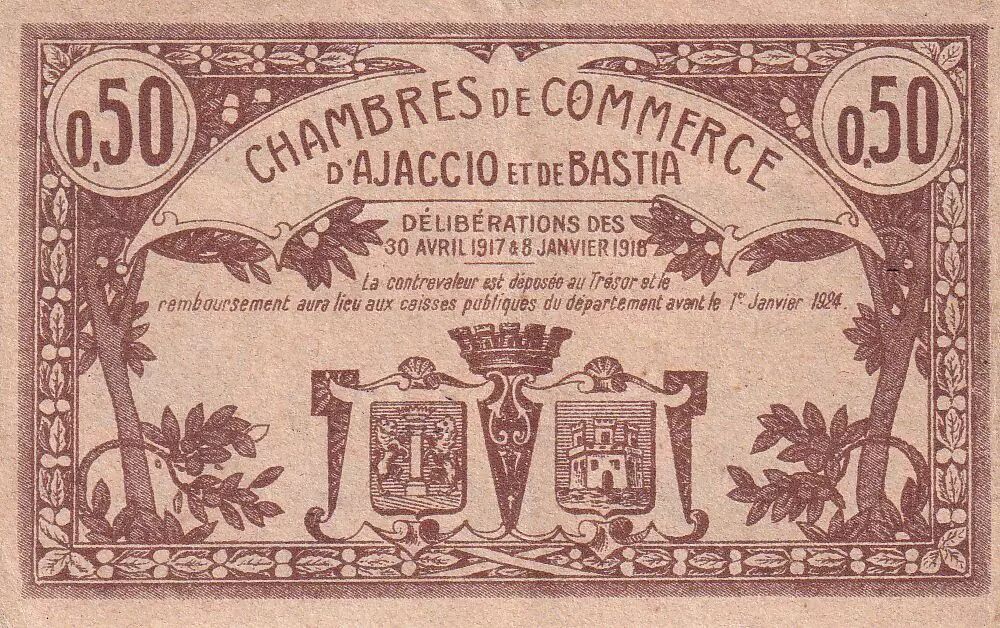 Billet France 50 Centimes - Chambre de commerce d'Ajaccio et Bastia - 1918 - Série B - P.3-6
