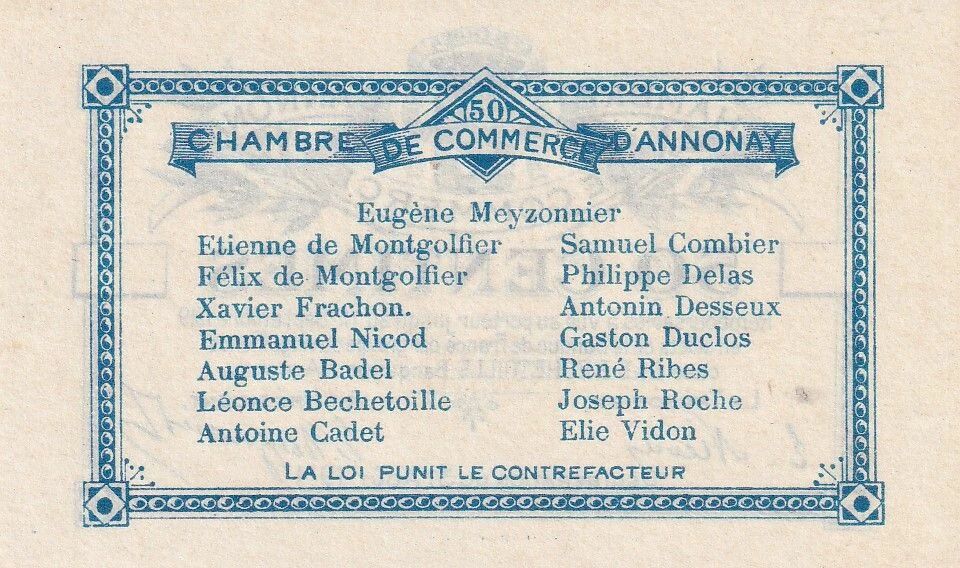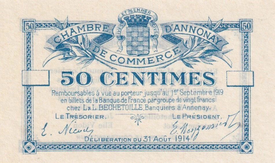 Le bon de 50 centimes de la Chambre de Commerce d?Annonay daté du 31 août 1914 appartient aux projets de monnaies de nécessité non émis, conçus dans l?urgence au tout début de la Première Guerre mondiale. Dès les premières semaines du conflit, la disparition rapide de la monnaie divisionnaire pousse de nombreuses institutions locales à préparer des solutions monétaires.