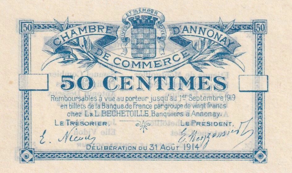 Le bon de 50 centimes de la Chambre de Commerce d?Annonay daté du 31 août 1914 appartient aux projets de monnaies de nécessité non émis, conçus dans l?urgence au tout début de la Première Guerre mondiale. Dès les premières semaines du conflit, la disparition rapide de la monnaie divisionnaire pousse de nombreuses institutions locales à préparer des solutions monétaires.
