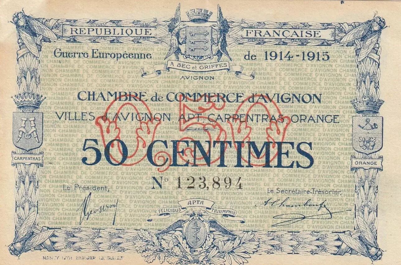 Ce type de billet a été émis afin de pallier le manque de numéraire métallique en circulation. La nécessité de maintenir les échanges commerciaux locaux a conduit la Chambre de Commerce d'Avignon à émettre cette monnaie de substitution.