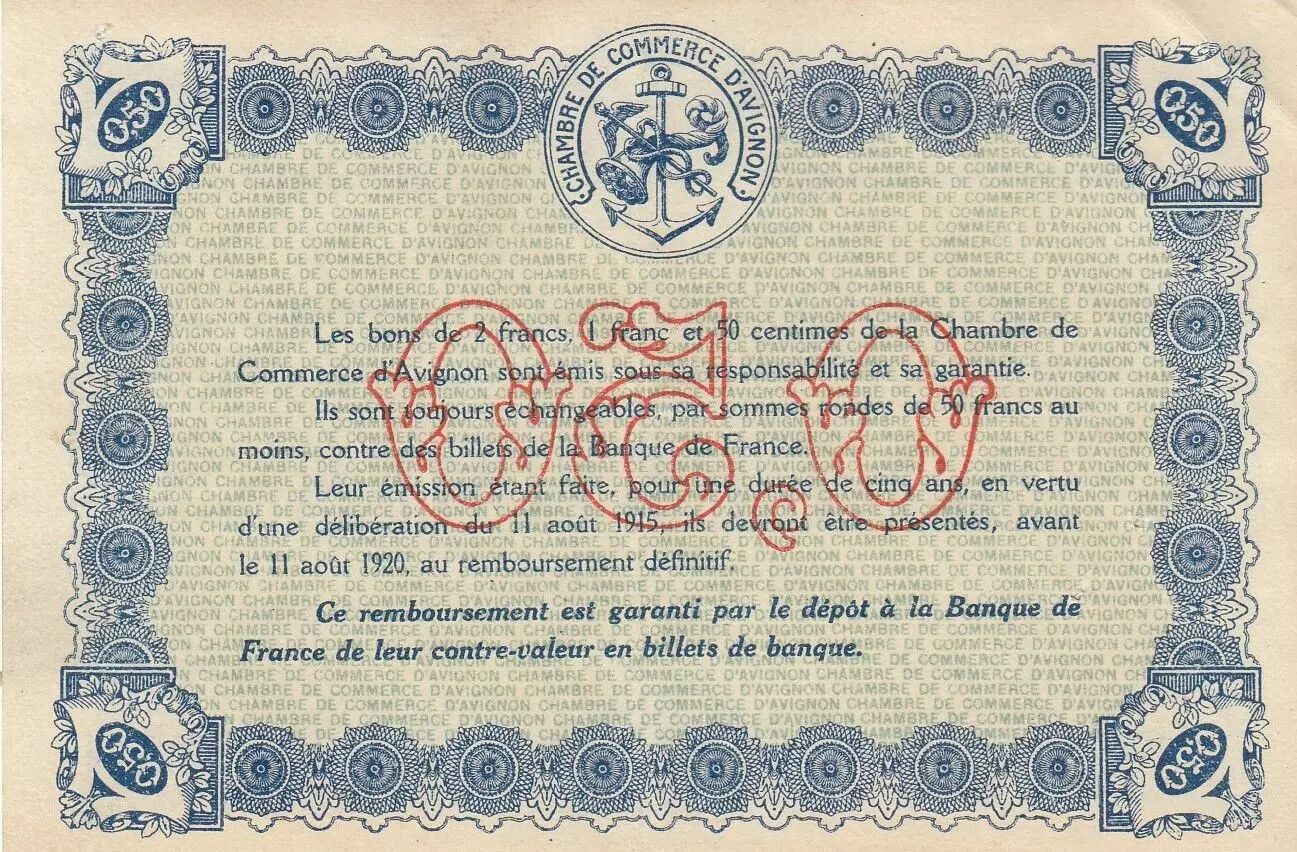 Le billet de 50 centimes émis par la Chambre de Commerce d'Avignon en 1920 appartient à la deuxième série de ce type d'émission. Ce billet de nécessité a été produit dans un contexte économique particulier, marqué par les conséquences de la Première Guerre Mondiale.