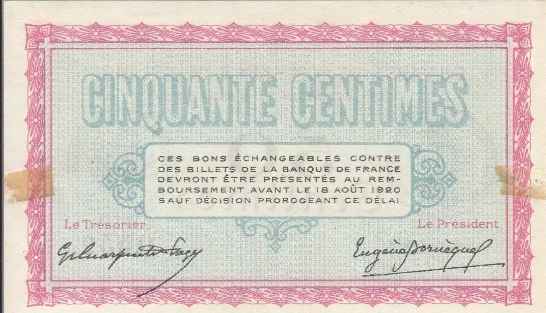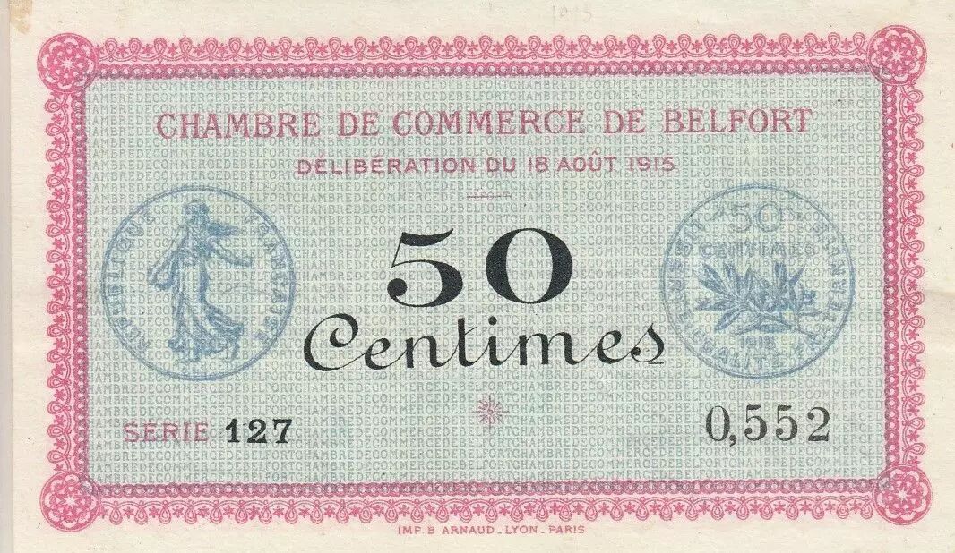 Ce billet de 50 centimes a été émis par la Chambre de Commerce de Belfort le 18 août 1915. Il s'agit d'un type de monnaie de nécessité, émis en période de pénurie de numéraire durant la Première Guerre mondiale.