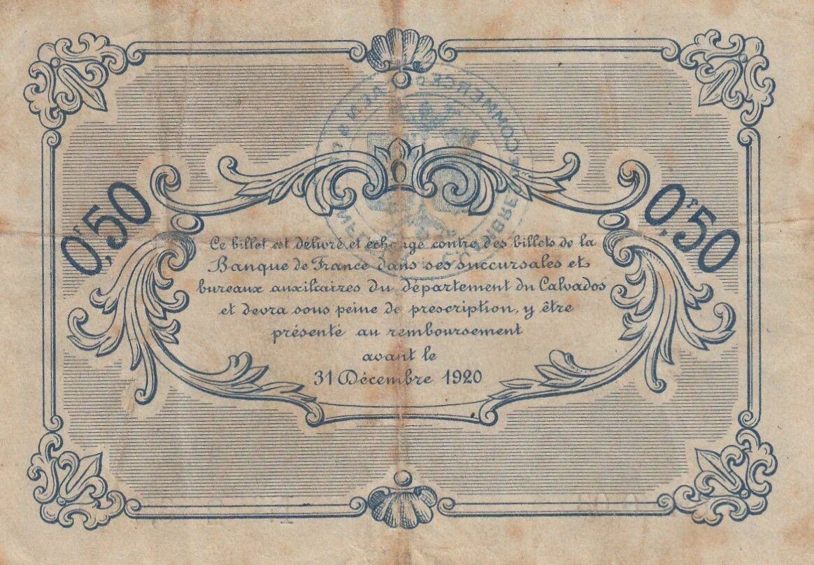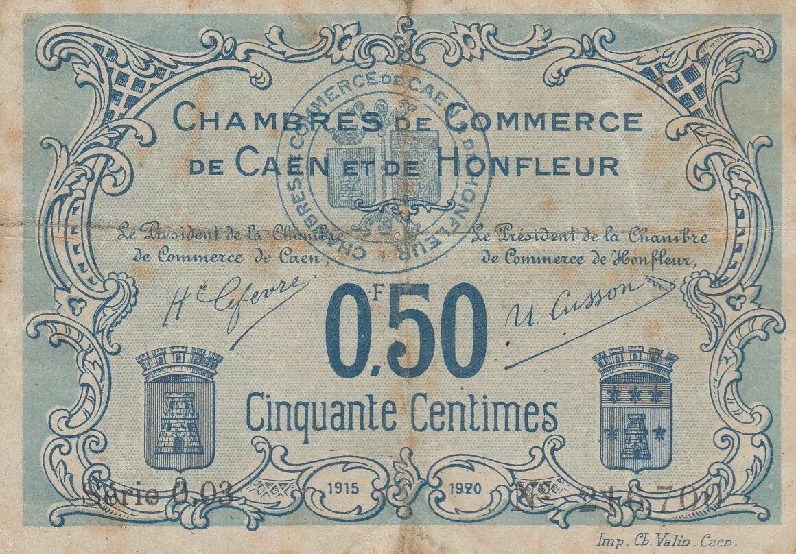 Ce billet de 50 centimes émis par les Chambres de commerce de Caen et de Honfleur est un exemple typique des billets de nécessité utilisés en France pendant la Première Guerre mondiale.