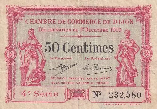 Ce billet de 50 centimes a été émis par la Chambre de Commerce de Dijon en 1919, il appartient à la 4ème série de cette émission. Le texte est rédigé en français.