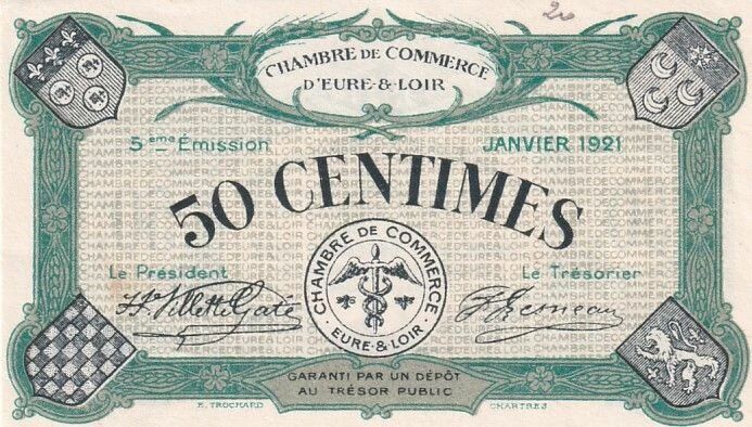 This 1 franc note, issued by the Chamber of Commerce of Eure-et-Loir, dates from January 1921 and corresponds to the 5th issue. The front of the note bears the mention "CHAMBRE DE COMMERCE D'EURE ET LOIR" in capital letters. It also includes the designation of the issue, "5ème émission janvier 1921", as well as the face value of "50 CENTIMES". The names of the President and Treasurer are printed, attesting to the responsibility of the signatories. The guarantee of the note is ensured by a deposit with the Public Treasury. The name of the printer, "E TROCHARD CHARTRE", also appears on this side.