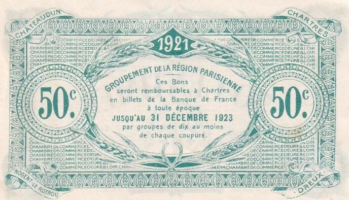 The back of the note bears the year of issue, "1921", as well as the mention "GROUPEMENT DE LA REGION PARISIENNE". Information regarding the reimbursement of the bonds is specified: they are reimbursable in Chartres in banknotes of the Banque de France, at any time until December 31, 1923, in groups of at least ten of each denomination. The cities of Châteauroux, Chartres, Nogent-le-Rotrou and Dreux are also mentioned.