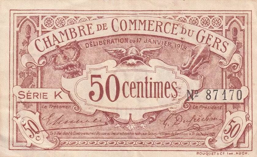 Le recto du billet affiche la valeur nominale de "50 centimes" en toutes lettres, accompagnée des chiffres "50c" répétés deux fois. Les signatures du trésorier et du président de la Chambre de Commerce sont également apposées. Le recto porte les noms de J.E.LACOSTE, en tant que concepteur (Inv.), et E.COLLASSON, en tant que graveur (Grav.), ainsi que celui de l'imprimeur, BOUQUET & Co Imr AUCH.
