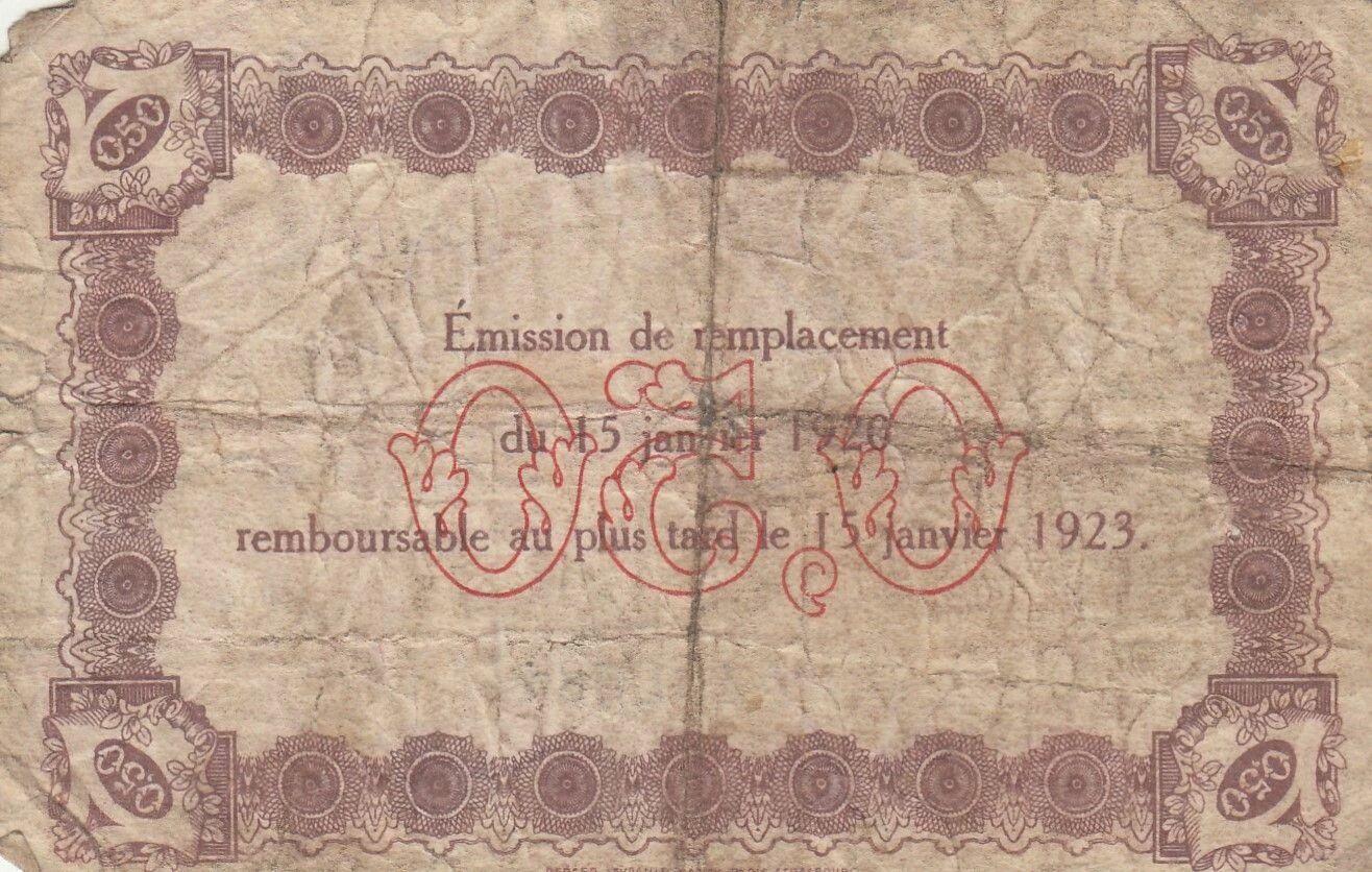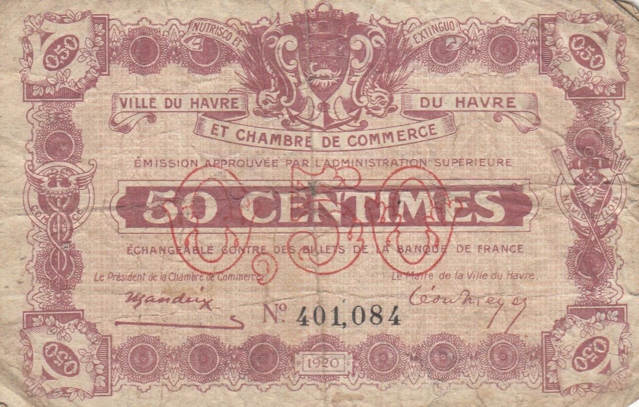 Ce billet de 50 centimes a été émis par la Chambre de Commerce du Havre en 1920. Il représente une forme de monnaie de nécessité, émise dans un contexte économique particulier.