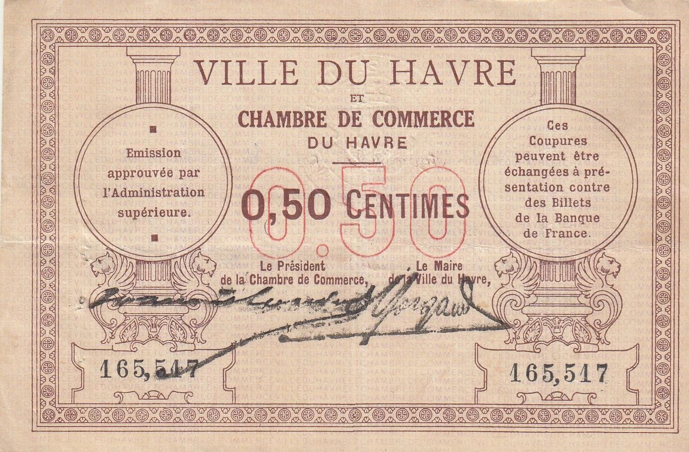Voici une description numismatique du billet de 50 centimes émis par la Chambre de Commerce du Havre entre 1914 et 1920.
