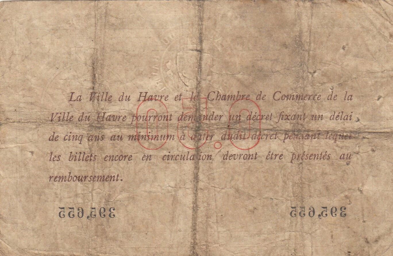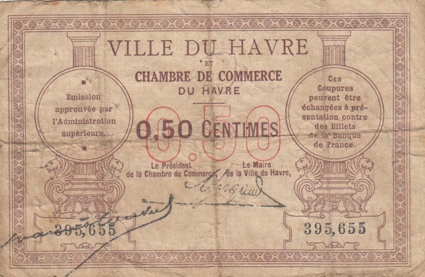 Ce billet de nécessité, d'une valeur de 50 centimes, a été émis par la Chambre de Commerce du Havre durant la période de la Première Guerre mondiale et ses suites immédiates. Il s'agit d'un témoignage des difficultés économiques et de la pénurie de monnaieDivision monétaireDivision monétaire en période de conflit.